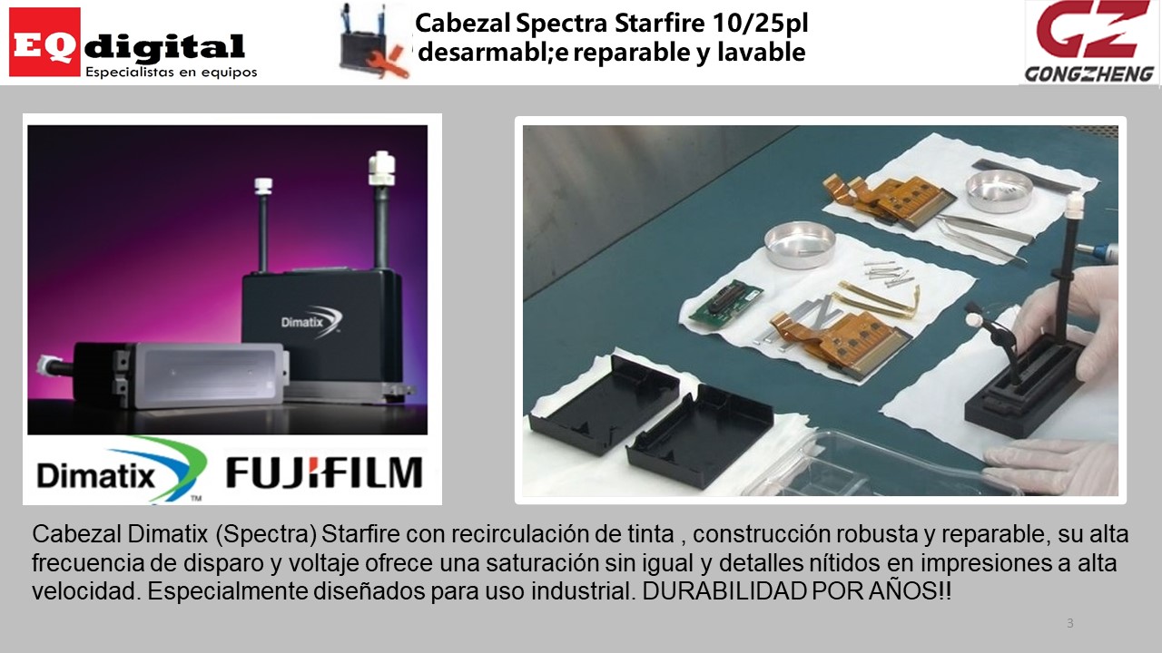 Cabezal Spectra Starfire 1024 con recirculacion de tinta que previene bloqueos y asegura provision de tinta en impresion a alta velocidad. Desarmable para limpieza. EXTRA DURACION!