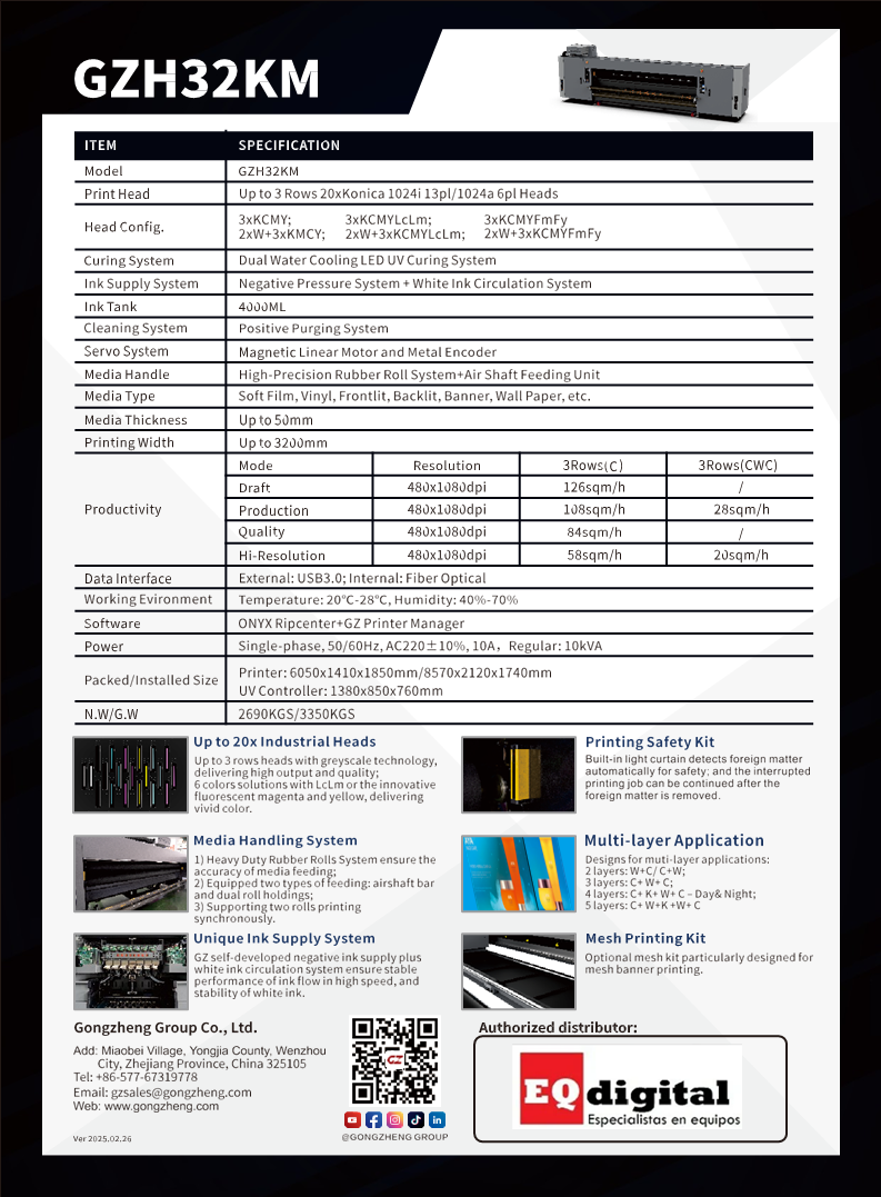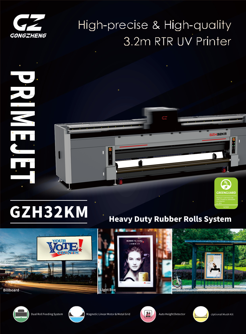 La impresora doble ancho 320 UV-LED  rollo a rollo  GZH32KM  esta especialmente diseñado para la impresión rollo a rollo de alta calidad de casi cualquier tipo de material, lona, vinilo, cuerina, poliester, telas plásticas, cueros e incorporando su exclusiva función de impresión de material para backlite ultra delgado .Con tintas de curado UV de alta durabilidad y bajo costo y un sistema de impresión de 5 colores CMYK+W . Lámparas UV-LED de mínimo consumo y mayor durabilidad.brinda un curado simple y eficiente.
